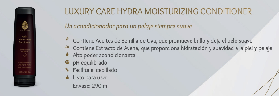 Pensado para los que valoran en sus mascotas la alta calidad, productos sofisticados y que ofrecen excelentes resultados, nace Luxury Care. Ideal para banar a perros y gatos en casa, es el producto perfecto para mantener el pelaje en magnificas condiciones y alargando el tiempo entre servicio y servicio con el peluquero profesional.