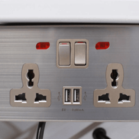 - Consola Eléctrica: Enchufes integrados para conectar tus herramientas directamente en la base.