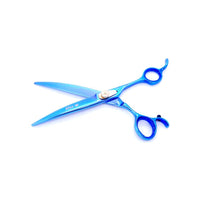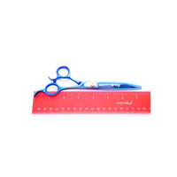 Super vastago corto con estilo moderno y destello. Inserciones de plastico azul extraibles con un poco de brillo. Tornillo de ajuste de tension dorado para amueblar y completar esta tijera.