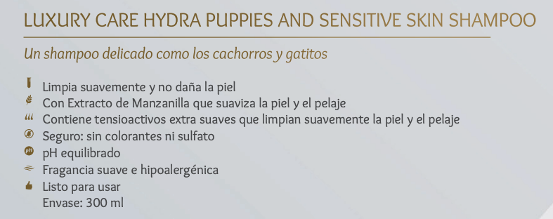 Pensado para los que valoran en sus mascotas la alta calidad, productos sofisticados y que ofrecen excelentes resultados, nace Luxury Care. Ideal para bañar a perros y gatos en casa, es el producto perfecto para mantener el pelaje en magníficas condiciones y alargando el tiempo entre servicio y servicio con el peluquero profesional.